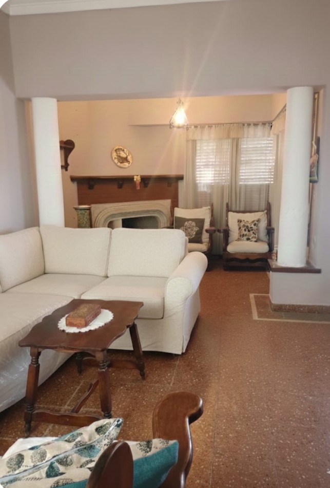 Cálido living comedor al frente con hogar a leña y amplios ventanales que brindan excelente luminosidad.